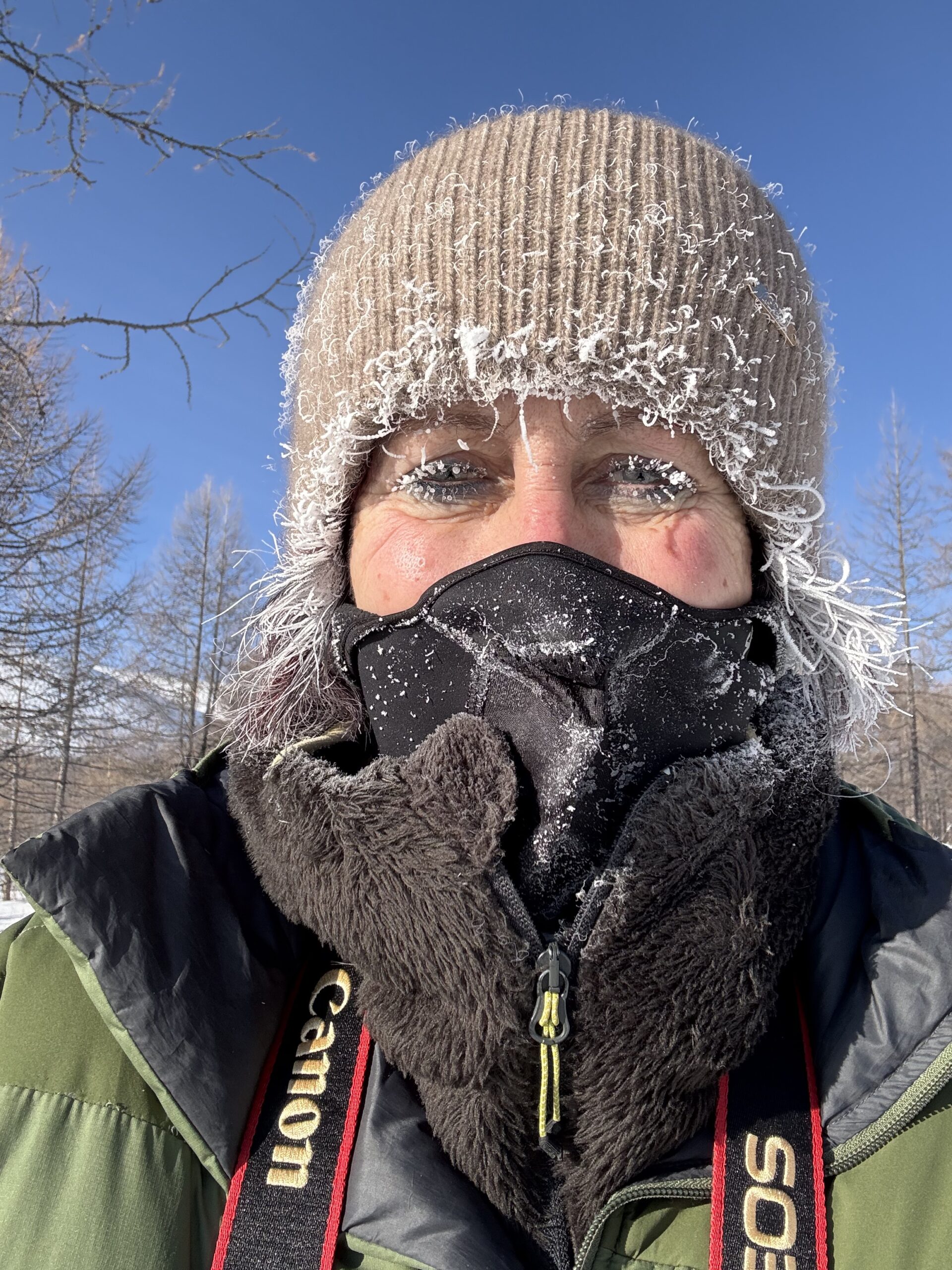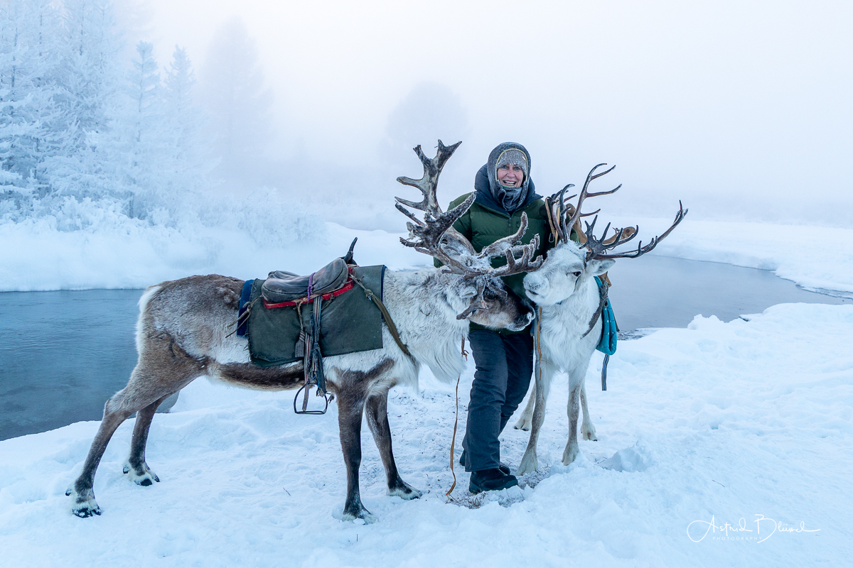 This is the winter tourist hotspot and soon Korean and Mongolian tourist swarm the place, we are the hit with our reindeer, lucky them, they get an extra cool photo thanks to us. We get super sensational photos even though the fog is creeping in more and more. It gets so bad we can’t see the trees anymore, we have to stop, so we warm up in the car and get a nice hot cup of tea. After that, with more light and a temperate of only -38°C we get more great shots, it is so unbelievably beautiful here.