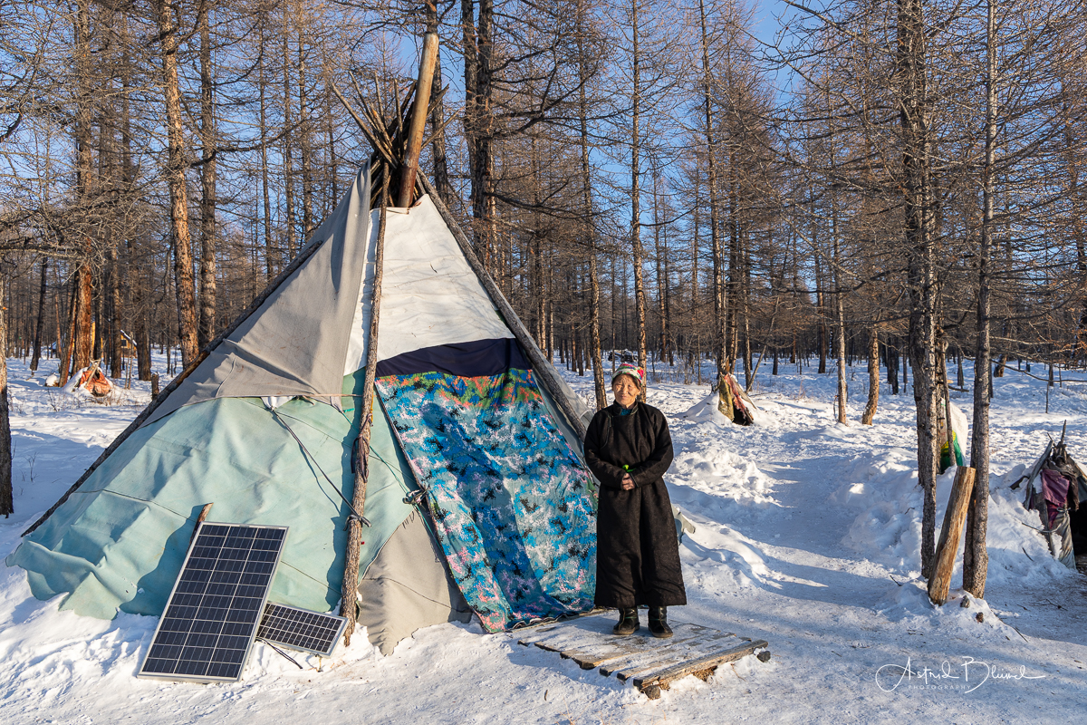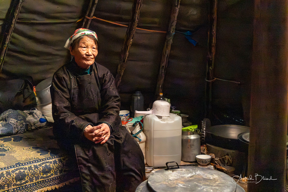 We reach Tsaagaanur in 75min, then another 75min more to the reindeer village. There isn’t a soul around, a few tipi, a few wooden houses, 2 dogs, not a reindeer in sight. We are welcomed by a grandmother in the first tipi, get to sit inside and photograph her. She lives here alone, her husband died last year. Just a tipi, the little belongings she has, 2 beds, an oven and a battery to charge her phone, but she seems totally content and happy.