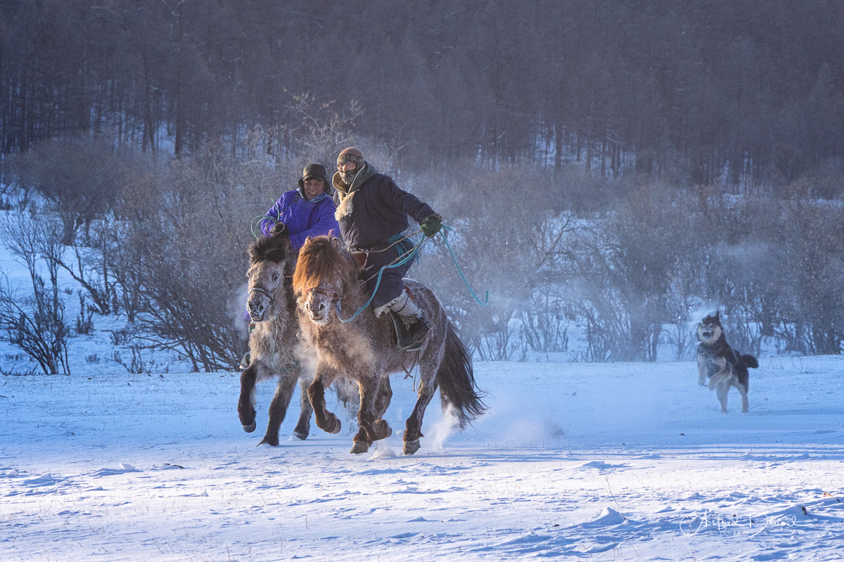 As we leave our driver Esee points, look horses. They all love horses here in Mongolia, I believe there are more horses than people in this country ! The horses flanks are white, their sweat instantly freezes giving them a very special icy look. They wave and put up a show for us, so cool.
