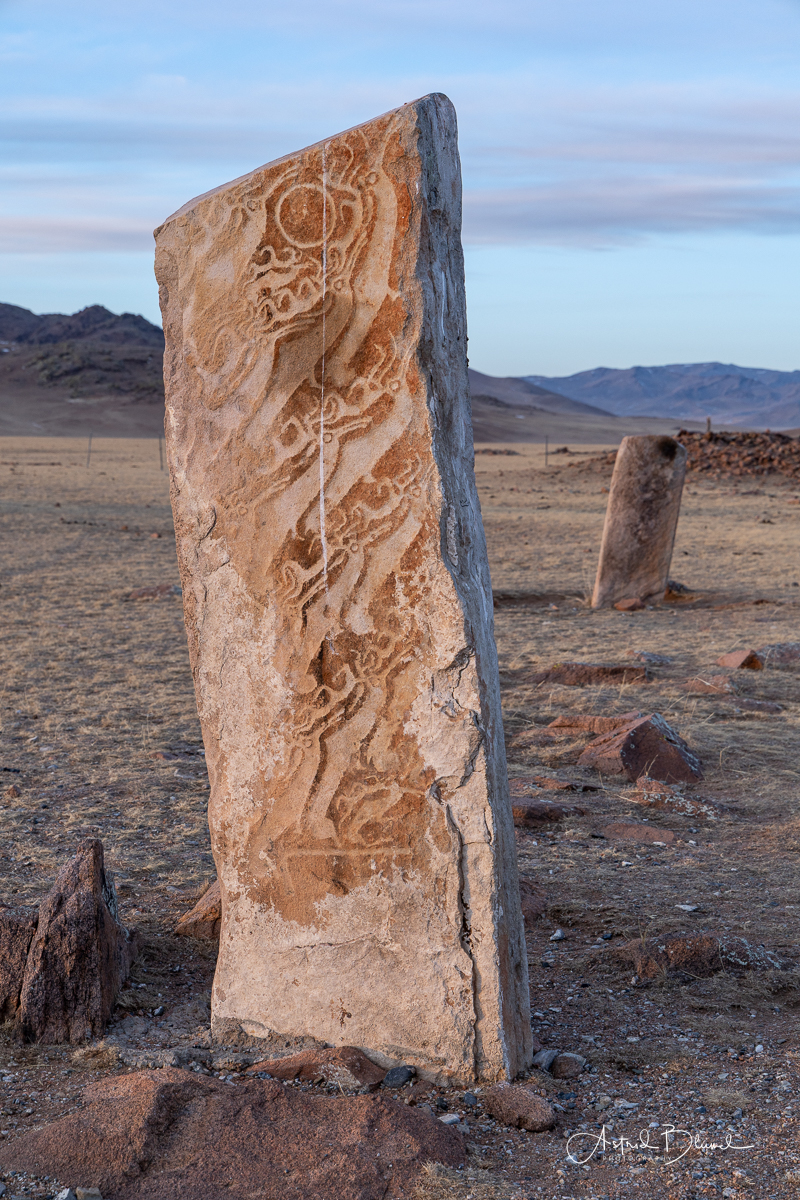 From there on to the Uushigiin Deer Stones, a form of rock art, often associated with ritual sites, widespread throughout northern Mongolia. It is a collection of stone pillars with deer motives on them dating back to 500 to 800BC. Two or three are really amazing, the deer drawings are totally clear in a reddish and beige color, and in the setting sunlight it does look special. My clothing for the extreme cold has just passed the first test, I wasn’t cold for one second, okay with 3 layers of clothing and my ice fighter boots it just had to work, but now I know for sure.