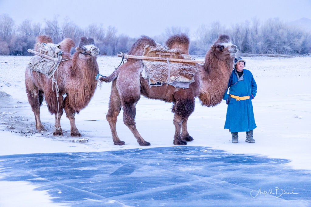 Breakfast is fine and the camel guy is ready. So lets go. It is so cold the snot freezes in your nose the moment you step outside. Welcome to another freezing morning at -35°C. Unfortunately it snowed a bit last night so the cracks in the ice were no longer visible. We tried camel shots with the very feeble sunrise in the background, then side-lit closer shots, which I liked best. Now lets finally move north to the reindeer people, can’t wait !