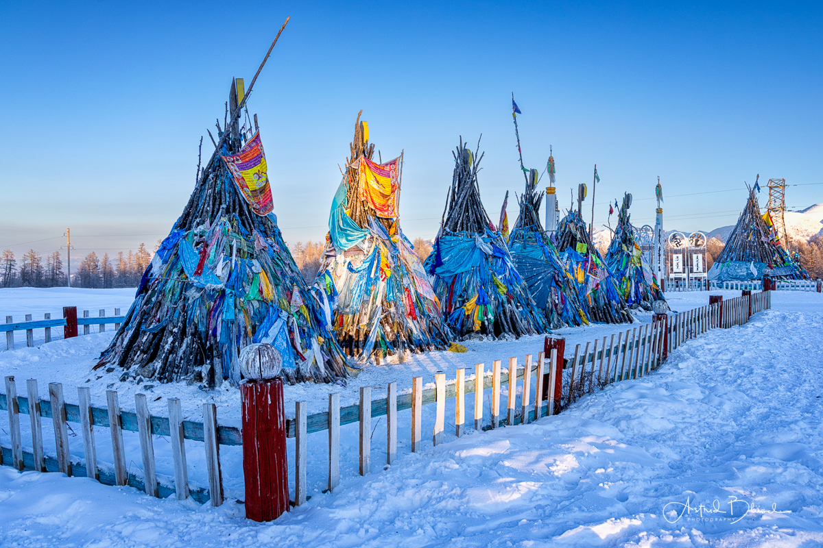 The ride is bad but the views are amazing, we drive along and in a frozen river, cross passes where at the top we see funny blue tipi, covered in all sorts of colorful threads and stuff, they are religious signs for well-wishing and are called Ovoo. First just one, but shortly before we reach our goal a whole load of them. This spot is called Uliin Khalzan Davaa. It is the threshold to the Darkhan Valley also called Darkhan depression but that is a depressing name for such a beautiful place, valley sounds much better. The sun is setting, but a few rays still peep through. We have in the meantime reached a new temperature record of -38°C and it is unbelievably cold, my fingers, even in gloves, almost freeze off, I keep having to put the big mittens over them, without those you last 30 seconds at most. So pick what you want to shoot, quickly get your hand out, shoot and back into the mittens ! There are 12 tipi, according to the lunar cycle. I was born in the year of the sheep, the sign is a sheep with big curly horns, well I quite like that.