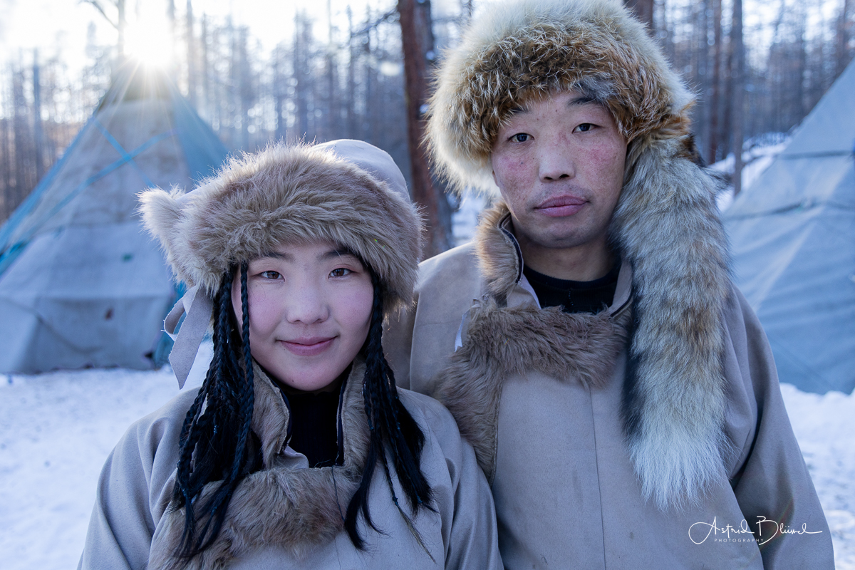 We were there to photograph the Tsaatan people also known as the Dukha. A nomadic tribe living deep within the taiga of northern Mongolia. They are among the very few remaining nomadic reindeer herding communities in the world. Today only approximately 400 Tsaatan individuals, about 70 to 80 families, live in small, tightly knit groups, entirely dependent on their reindeer herds for survival. The reindeer serve as means of transportation, are used for hunting, collecting firewood, seasonal migration and visiting relatives. They use the meat, the very nutricious milk and the skins for cover, clothing and boots.