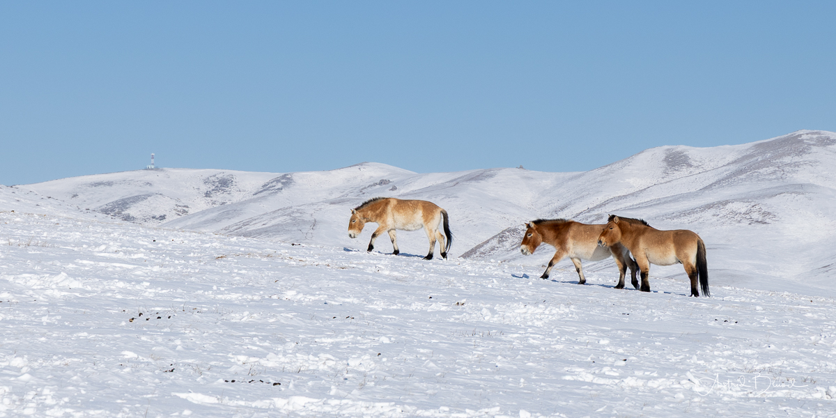 We start in the dark, but get a lovely sunrise with a pink sky that stays pink for ages. The road is good, little traffic, beautiful white landscape of valleys and hills. We take about 2 hrs to get to the Hustai NP. It is famous for red deer, white antelope and mostly for the very endangered wild horses called Prezewalski horses. Now let us try find them. We do see a lot of deer but they are very far away, and since I only have the 24-105 lens, they are tiny. Then we finally see the horses, they look pretty against the snowy background, but again very small. On the way back Adiye, the driver in the other car, who also happens to be a very famous Mongolian biologist (working with Kah Wai on the wild camel project), gets us to walk up a hill, and on the other side is a whole group of horses. Get some lovely shots of the horses with the snow covered hills in the background.
