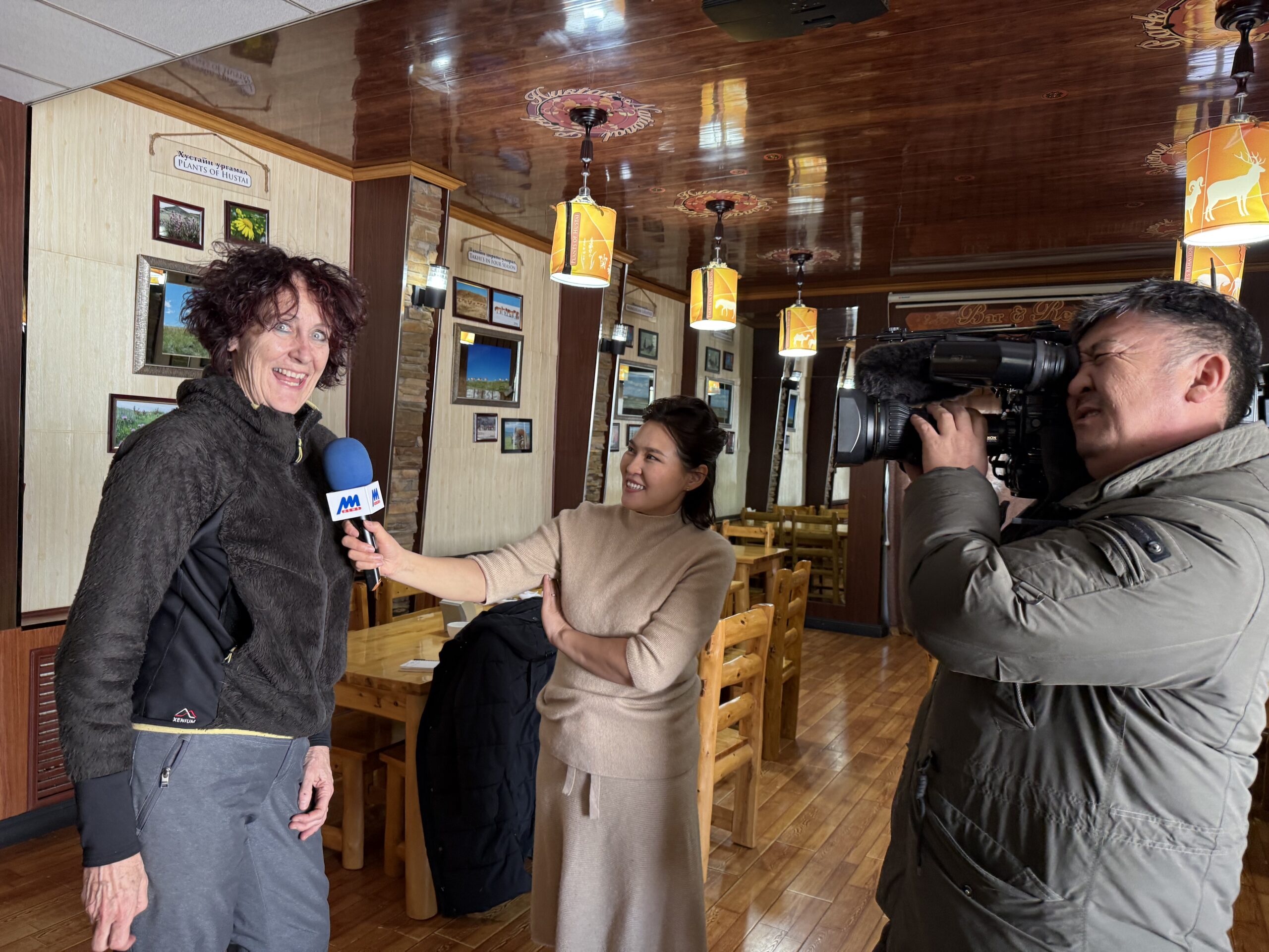 We get to watch a short video about the park, we are the only people there except for 3 Mongolian people at the next table. Suddenly our guide Uundra whispers in my ear, they are from Mongolian national television. If they can interview me? Sure ! The lady smiles at me and starts talking in rapid Mongolian, helplessly I look at Uundra for translation. They want to know why I am here and if I like it. Yes ! So I talk and Uundra translates, so funny.
